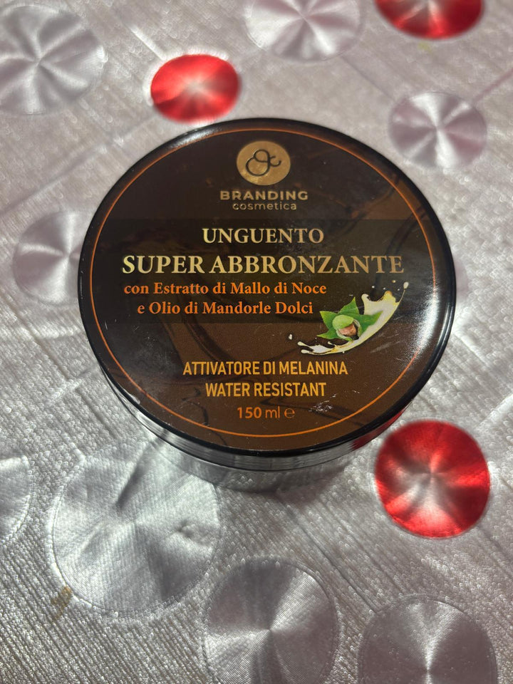 uguento super abbronzante con estratto di mallo di noci e olio di mandorle dolci.