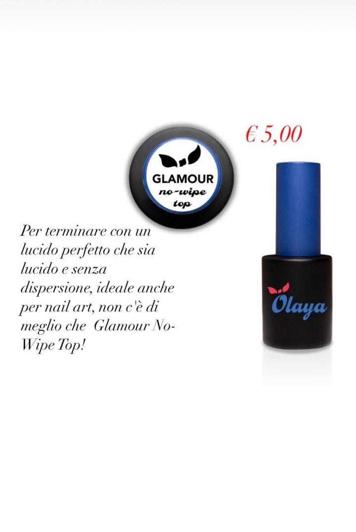 Per terminare con un lucido perfetto che sia lucido e senza dispersione, ideale anche per nail art, non c'è di meglio che il nostro Glamour No-Wipe Top!